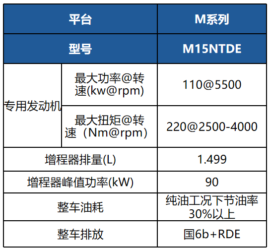滿(mǎn)足乘用車(chē)五階段和國6b+RDE排放法規,熱效率42%以上。M15NTDE發(fā)動(dòng)機已經(jīng)完成全工裝機驗證,M15NTDE發(fā)動(dòng)機為面向乘用車(chē)市場(chǎng)的新能源專(zhuān)用發(fā)動(dòng)機,已搭載T3高端SUV。